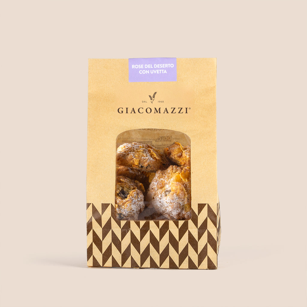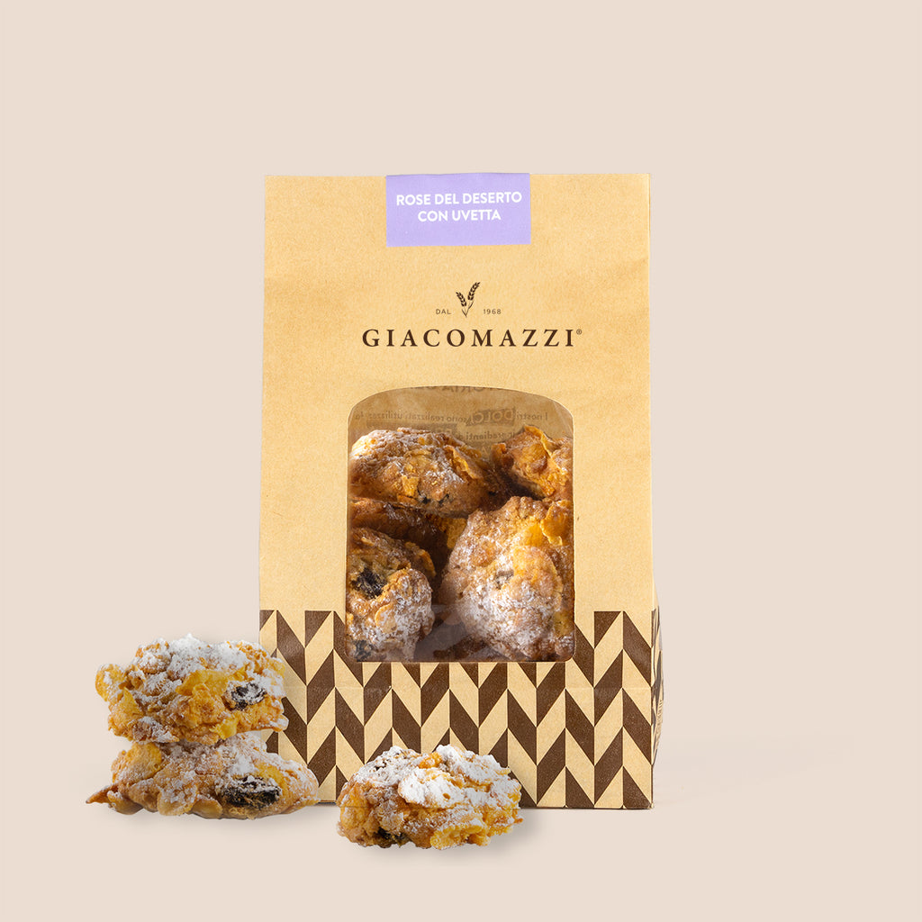 Desert roses, named for the particular shape reminiscent of the mineral present in desert landscapes, are tasty sweets with 100% Italian wheat flour and corn flakes. The tender heart, enriched with "Sun Muscat" raisins, is covered with crunchy and light corn flakes, creating a tasty mix that will conquer you at the first taste.