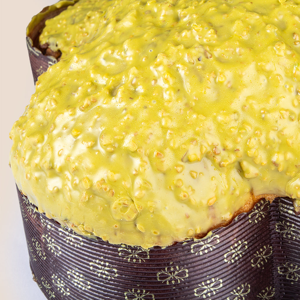 Farina di grano tenero tipo”00”, burro 16%, acqua, zucchero, uova cat.A 5%, miele, lievito madre di frumento, pasta d'arancia, latte intero, vaniglia, sale, gocce di Pistacchio 20% (zucchero, burro di cacao, pasta pistacchio(12%), siero di latte, lattosio, Emulsionante: lecitina di soia, Aromi, Colorante: E141). Glassatura (Zucchero, grassi vegetali (palma, shea, cocco), pistacchi (16%), latte scremato in polvere, biscotti [farina di frumento, zucchero, olio vegetale (cocco), amido, sale, zucchero caramellato, emulsionante: E 322 ( soia), aromi), latte in polvere, colorante: E 160a, emulsionante: E 322 (soia), estratti vegetali, sale, aromi, antiossidanti: E 304, E 306.